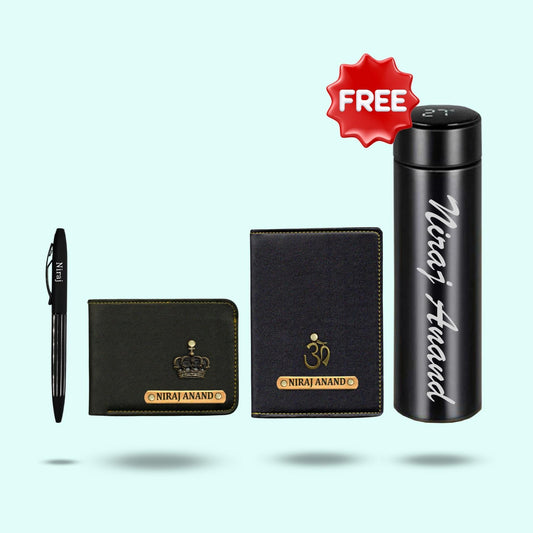 Personalized 5-in-1 Special Gift Hamper for Unisex ( Includes 1 Free Bottle ) - Card Holder, Passport Cover, Keychain, Sunglass Case, Bottle