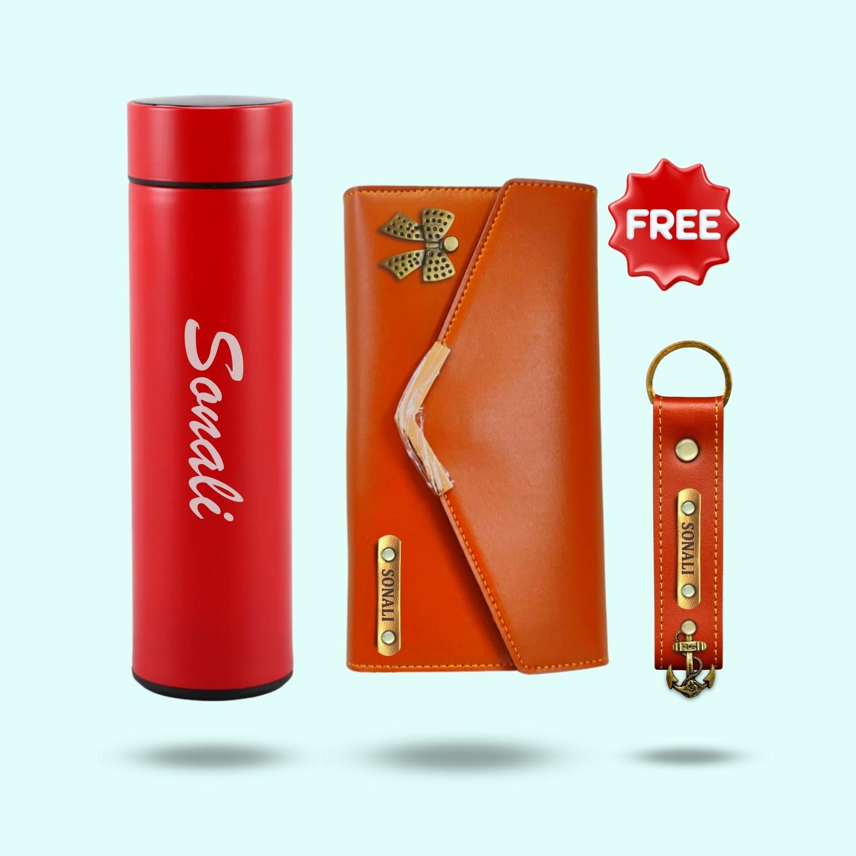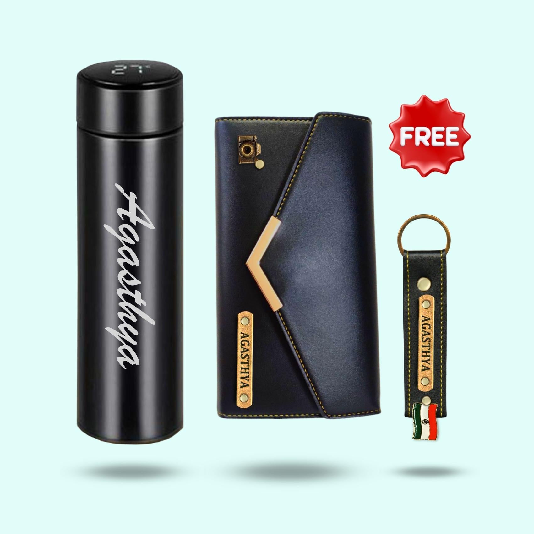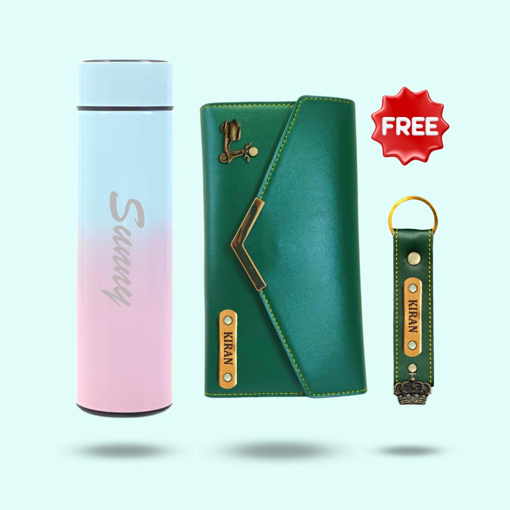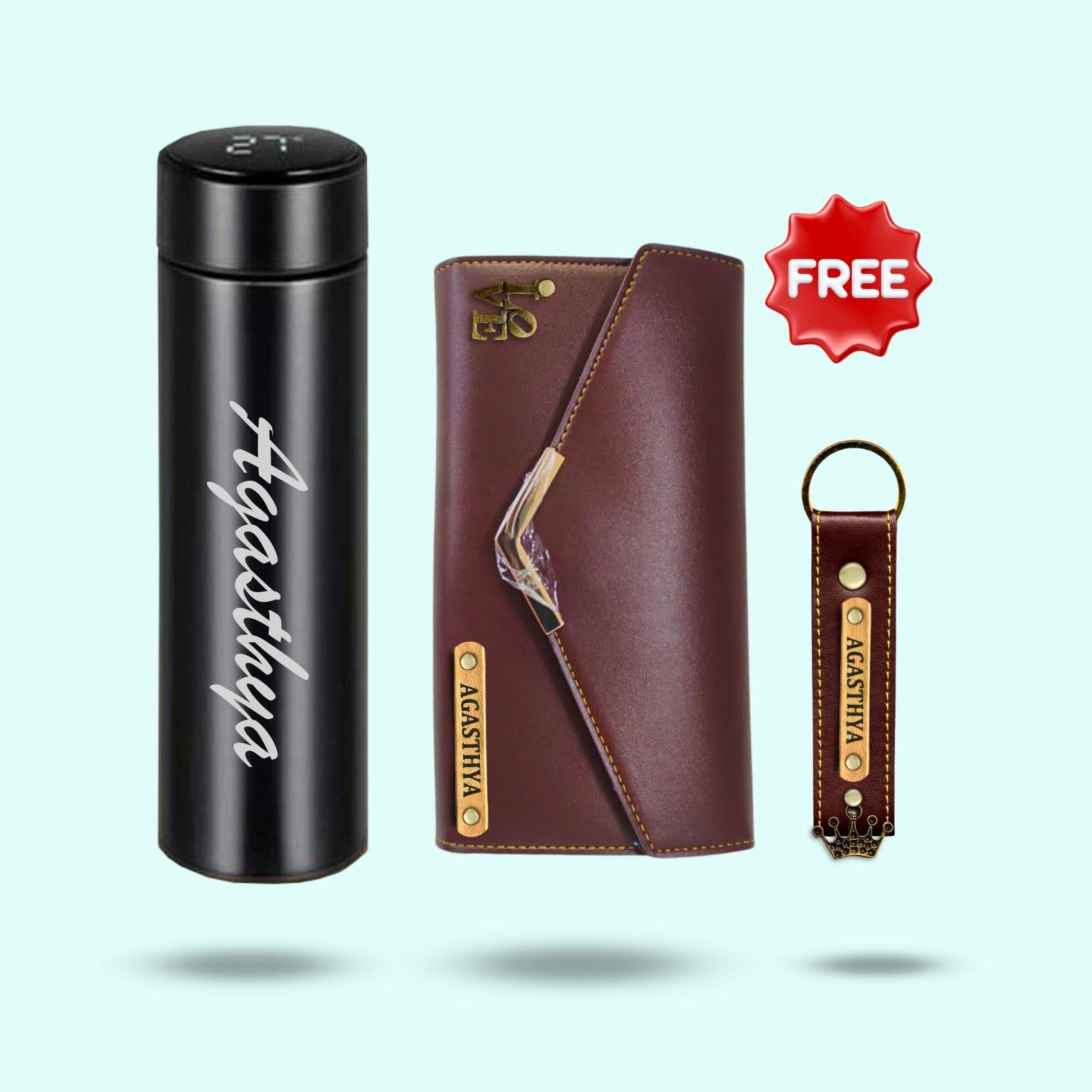 This hamper includes the most important things women need on a day-to-day basis. A Wallet for their cards and currency, a keychain for their keys & a temperature bottle with LED display for showing the water temperature.