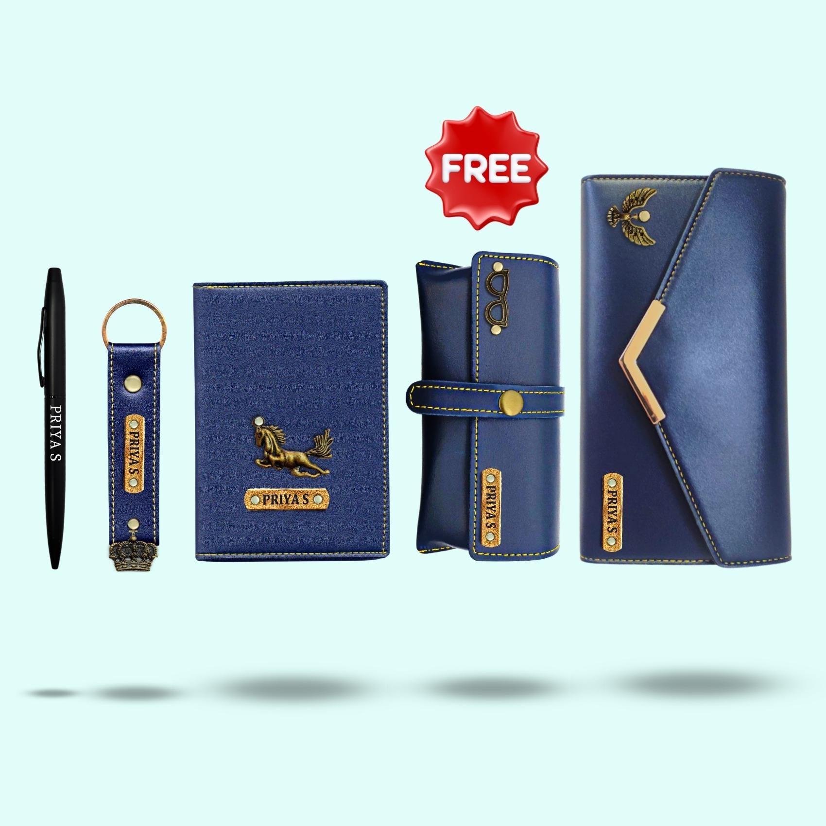 This hamper includes the most important things women need on a day-to-day basis. A Wallet for their cards and currency, a passport cover for their passports, a sunglass case for their shades/goggles, a keychain for their keys, & a Pen.
