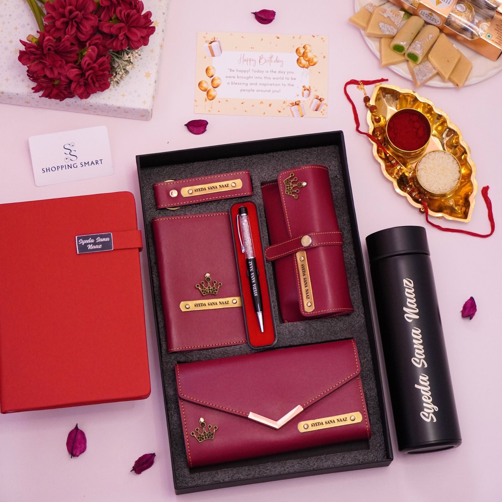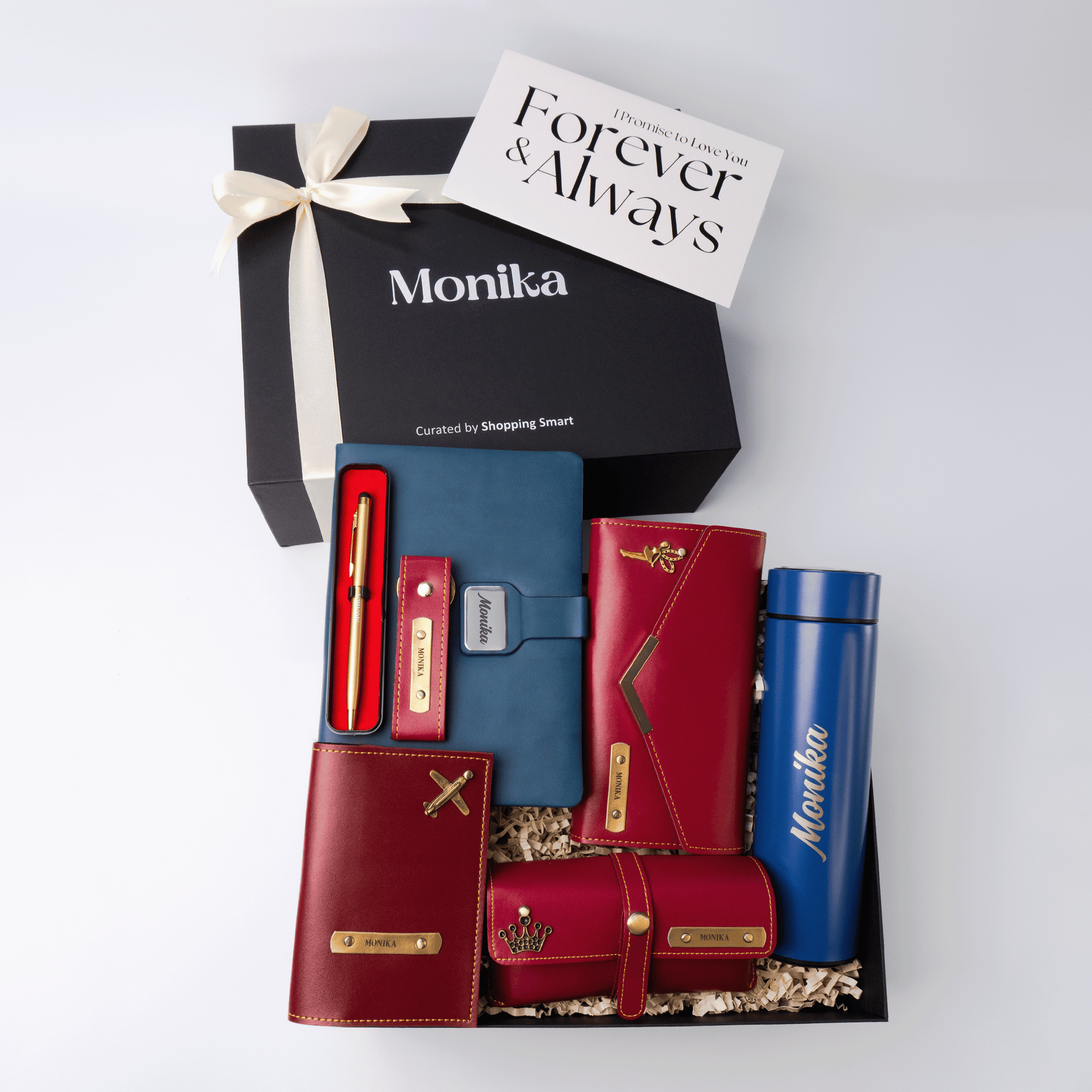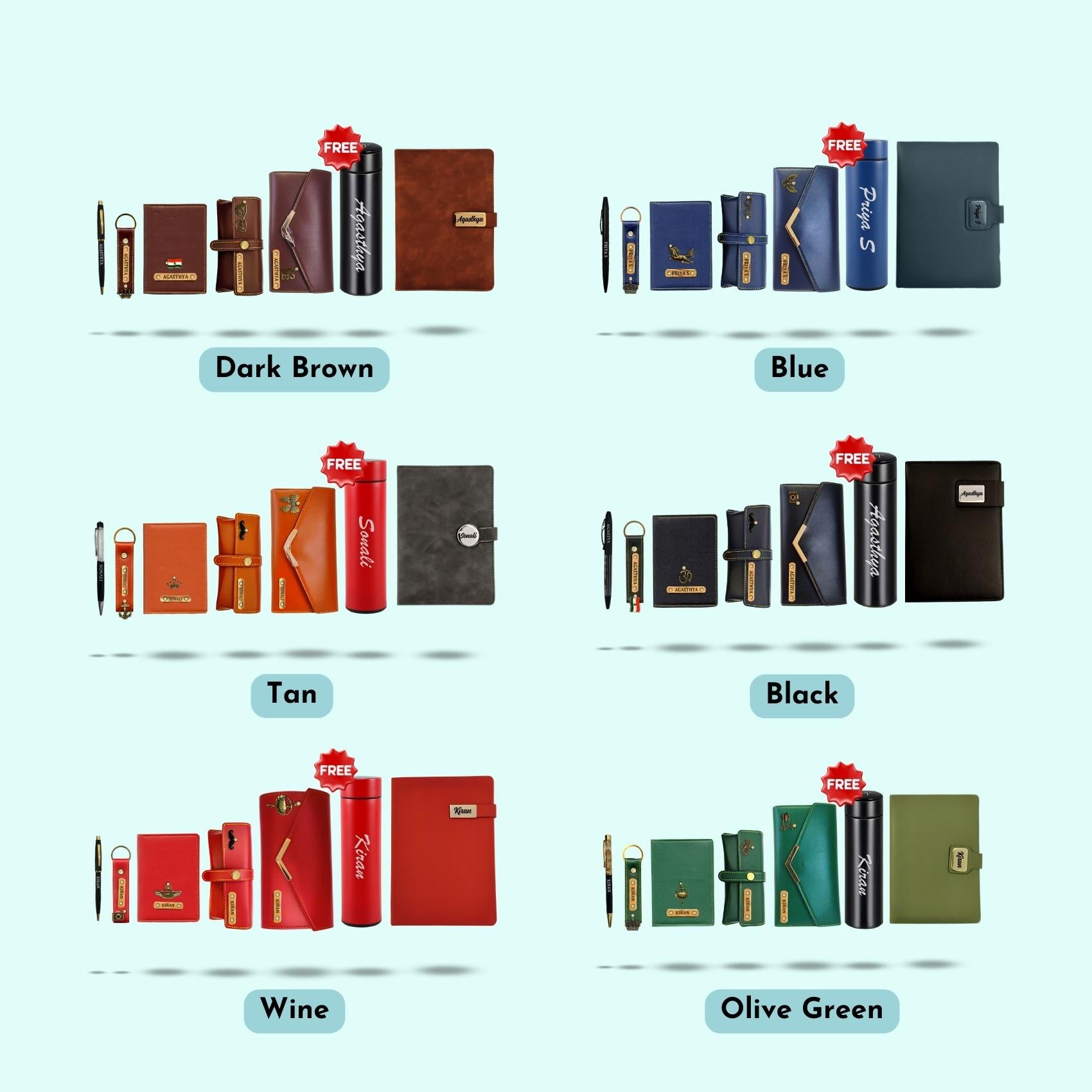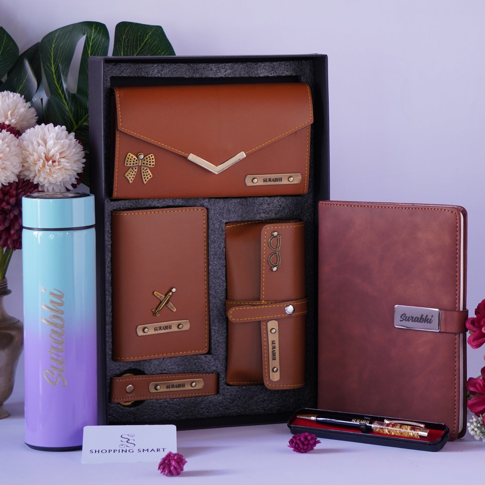 This hamper includes the most important things women need on a day-to-day basis. A Wallet for their cards and currency, a passport cover for their passports, a sunglass case for their shades/goggles, a keychain for their keys, a bottle with LED display for showing the water temperature, a Pen & a Diary is used to record events as they happen, or to plan for future events.