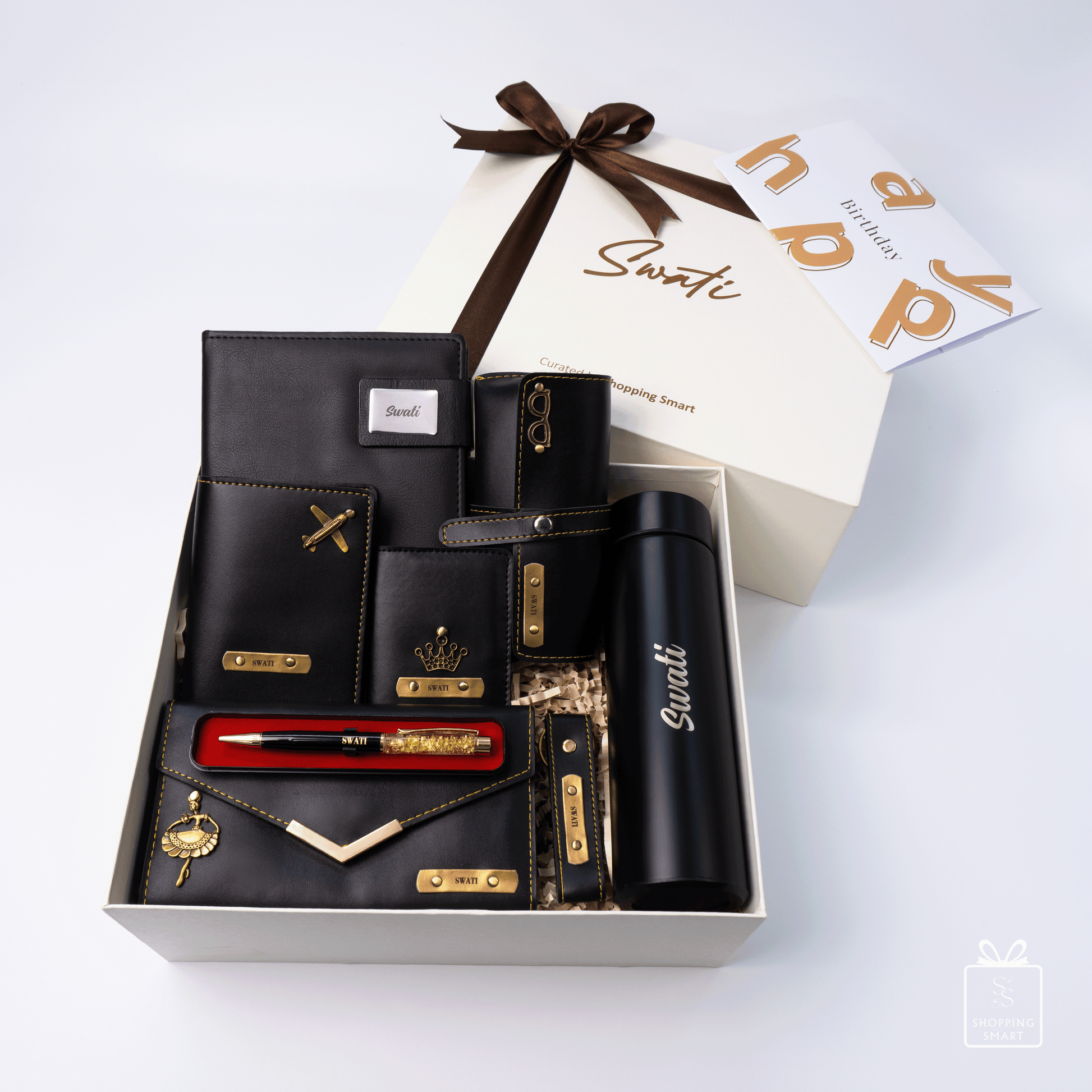 This hamper includes the most important things women need on a day-to-day basis. A Wallet for their cards and currency, a Card Holder for their cards, a passport cover for their passports, a sunglass case for their shades/goggles, a keychain for their keys, a temperature bottle with LED display for showing the water temperature, A Pen & a Diary is used to record events as they happen, or to plan for future events.