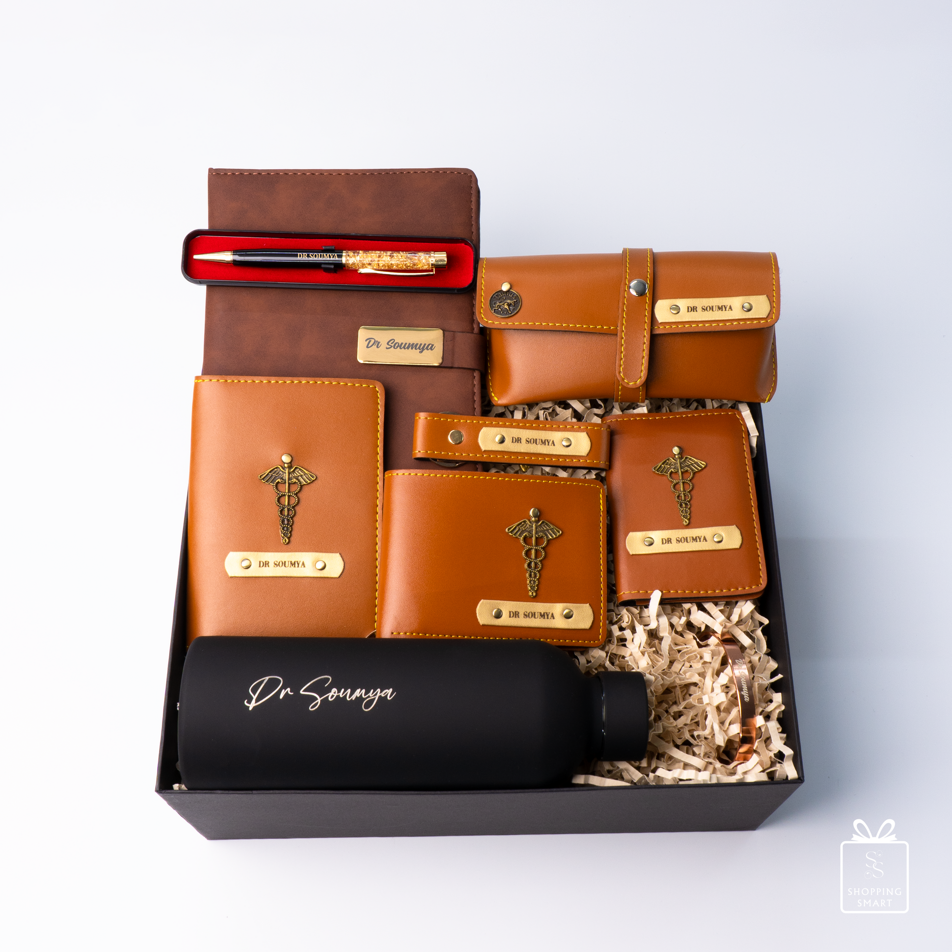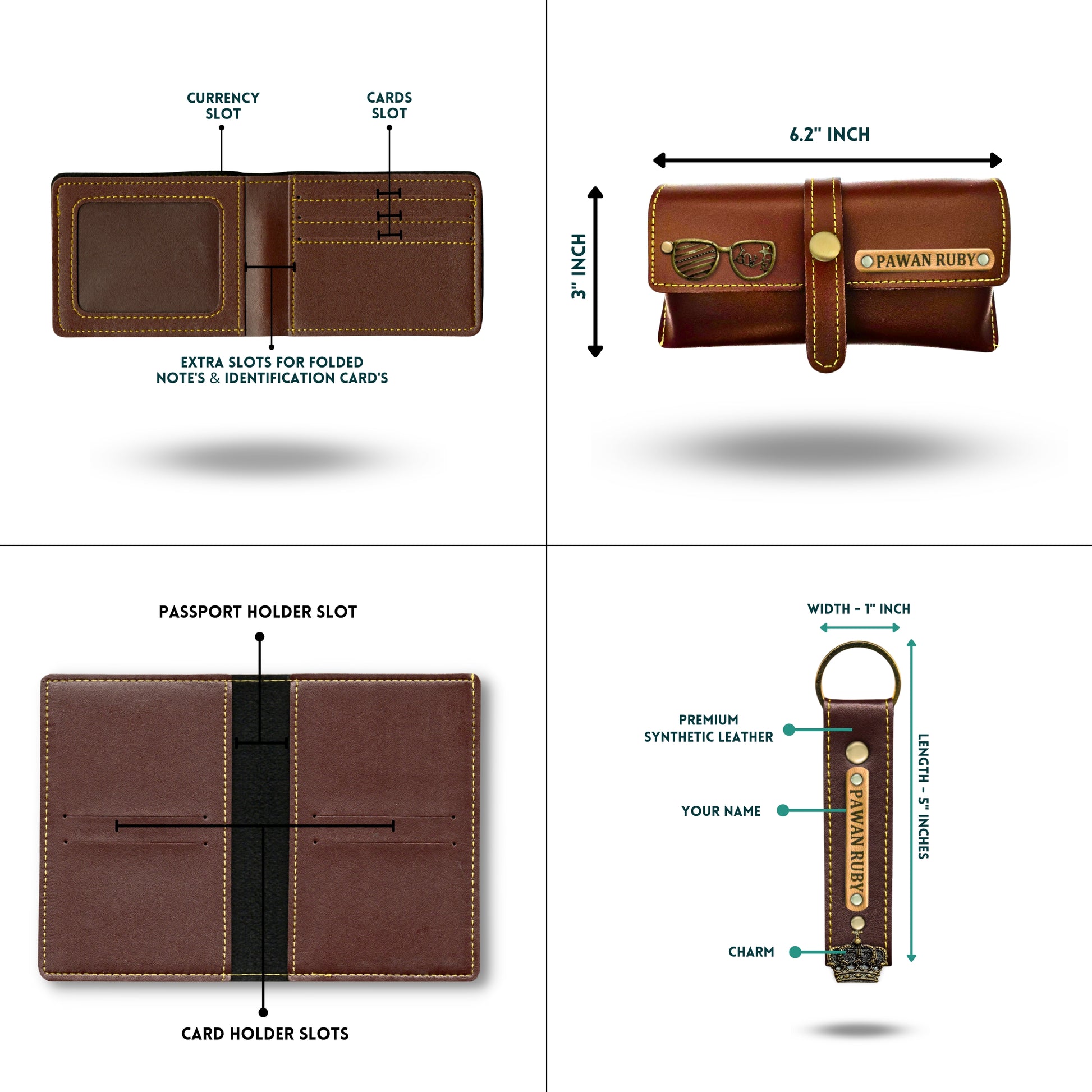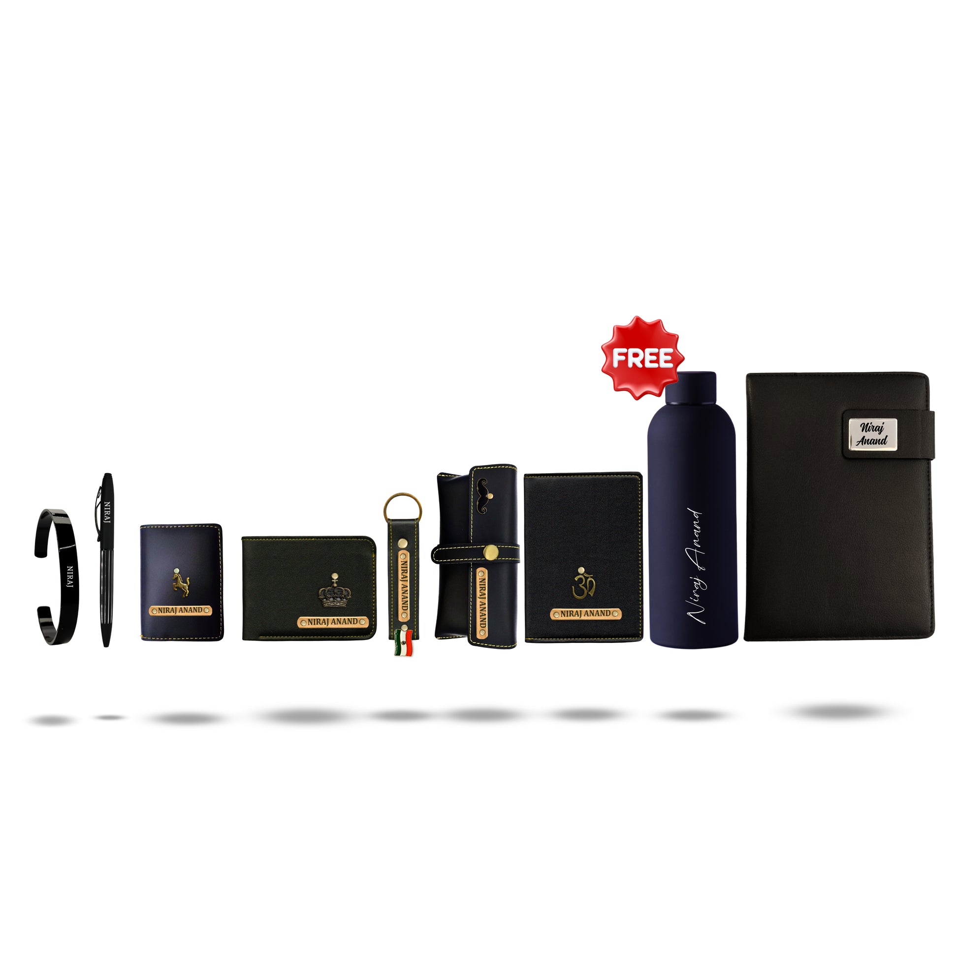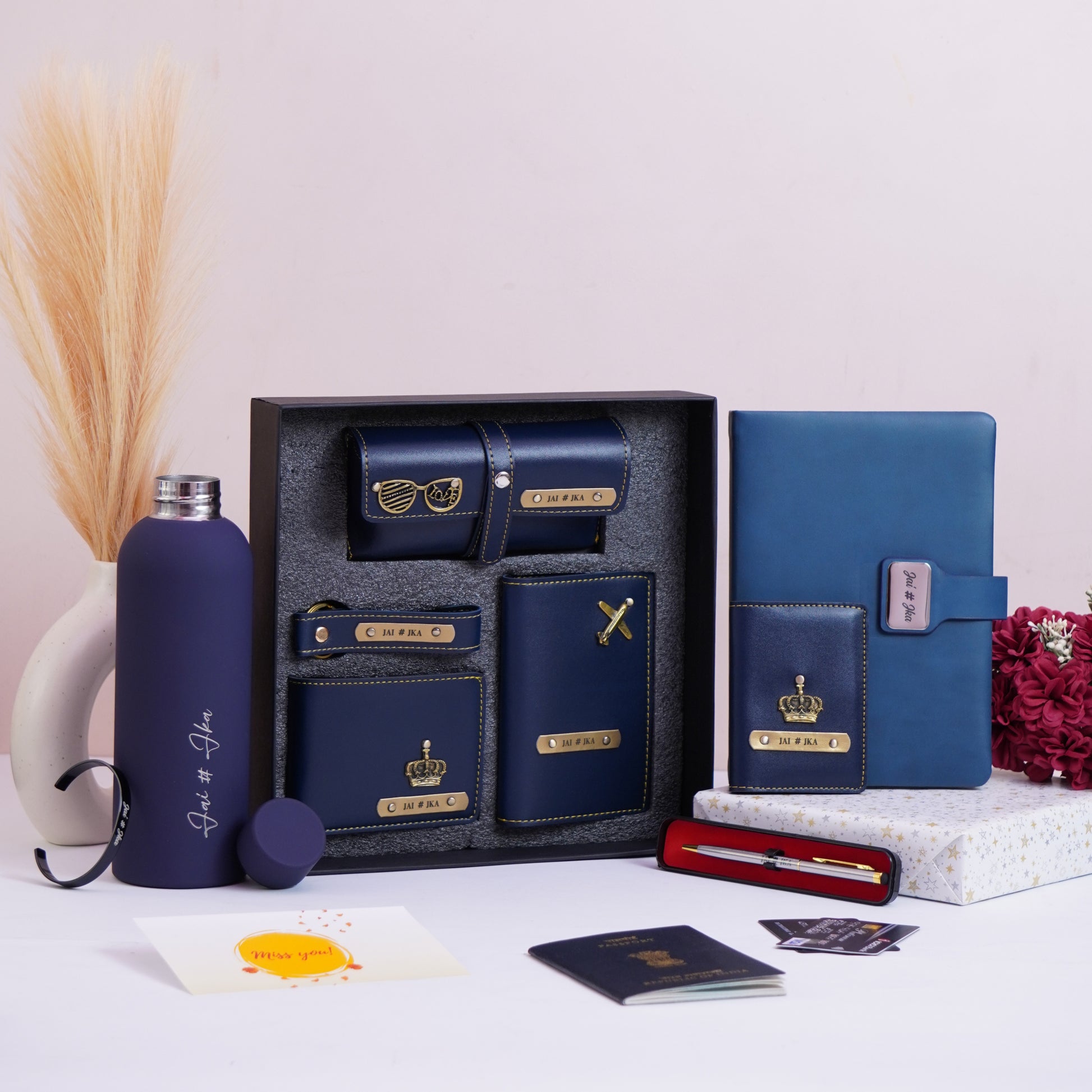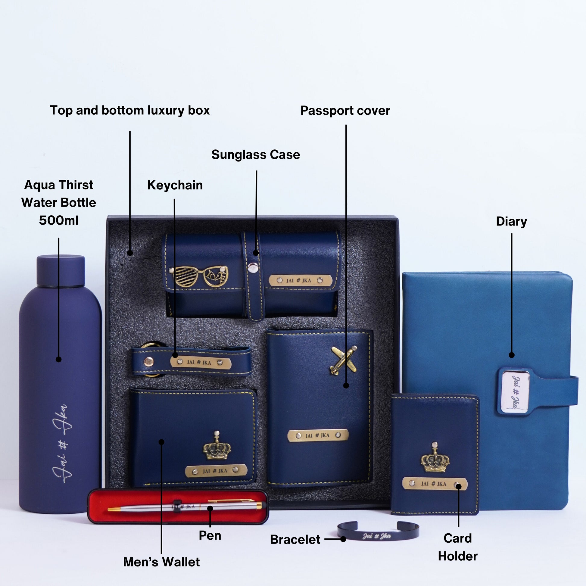 This hamper includes the most important things men need on a day-to-day basis. A Wallet for their cards and currency, a Card Holder for their cards, a passport cover for their passports, a sunglass case for their shades/goggles, a keychain for their keys, a Free Aqua Thirst water Bottle, A Pen, A Diary is used to record events as they happen, or to plan for future events & A Bracelet.