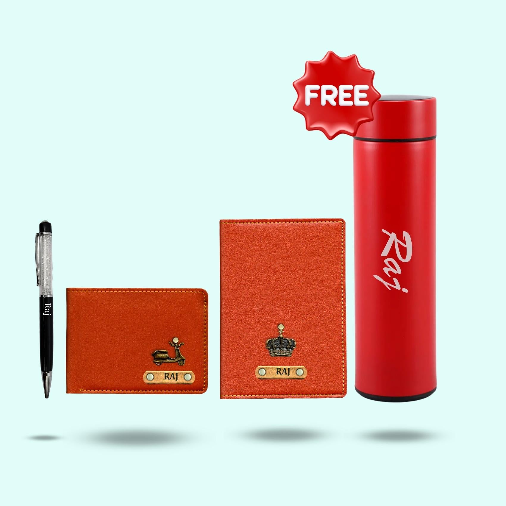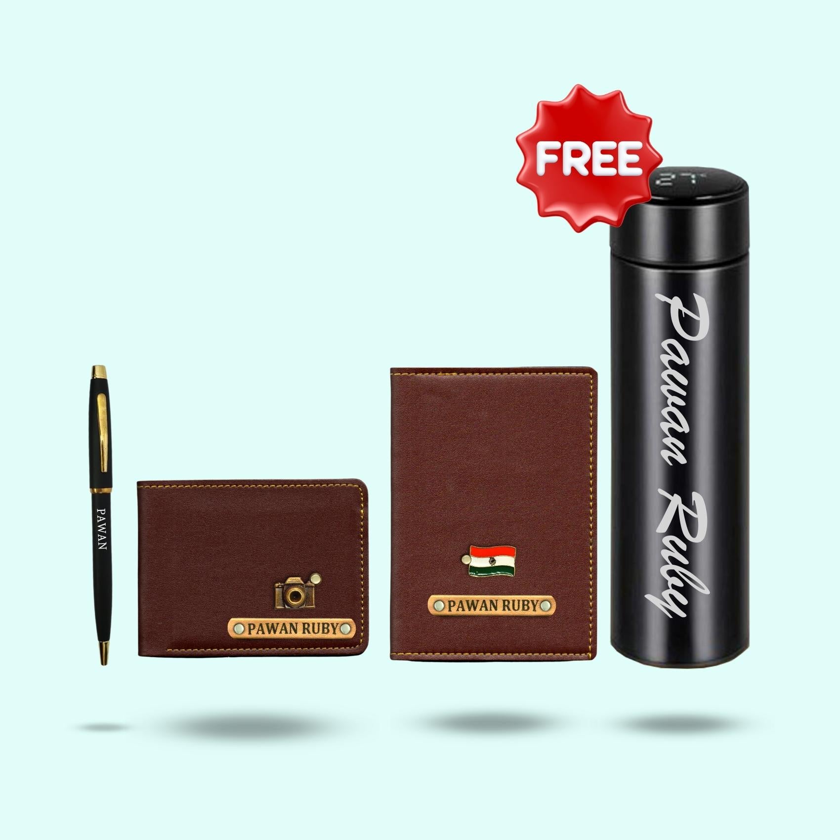 This hamper includes the most important things men need on a day-to-day basis. A Wallet for their cards and currency, a passport cover for their passports, a Pen, & a temperature bottle with LED display for showing the water temperature.