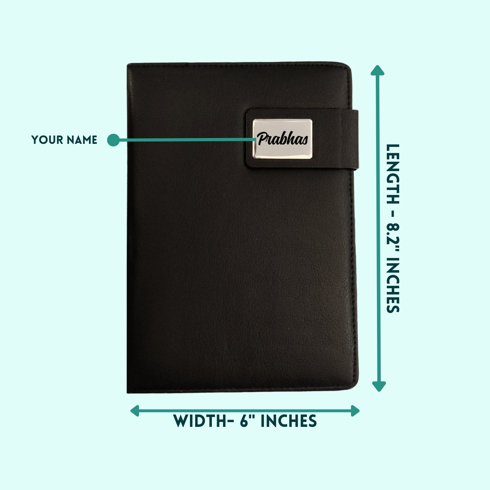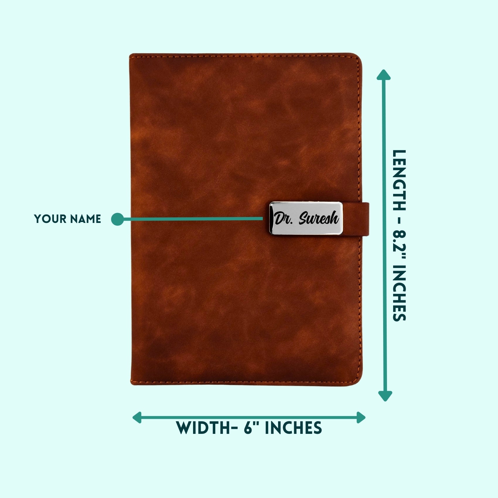 This Personalized Diary and Pen Combo includes a soft PU cover with metal name plate, fine stitching, and rounded corners. Every Diary & Pen features laser-engraved personalization for long-lasting designs. It's 150x205 mm, providing stylish, durable organization. Perfect for the professional look.
