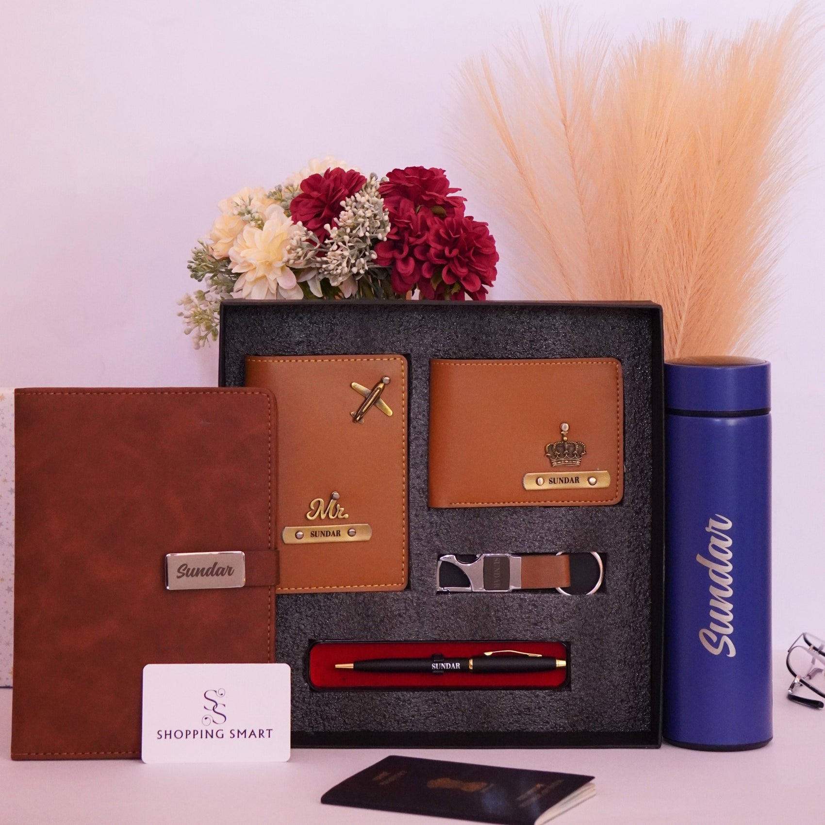 This hamper includes the most important things men need on a day-to-day basis. A passport cover for their passports, A Wallet for their cards and currency, a keychain for their keys, a temperature bottle with LED display for showing the water temperature, A Pen & a Diary is used to record events as they happen, or to plan for future events.