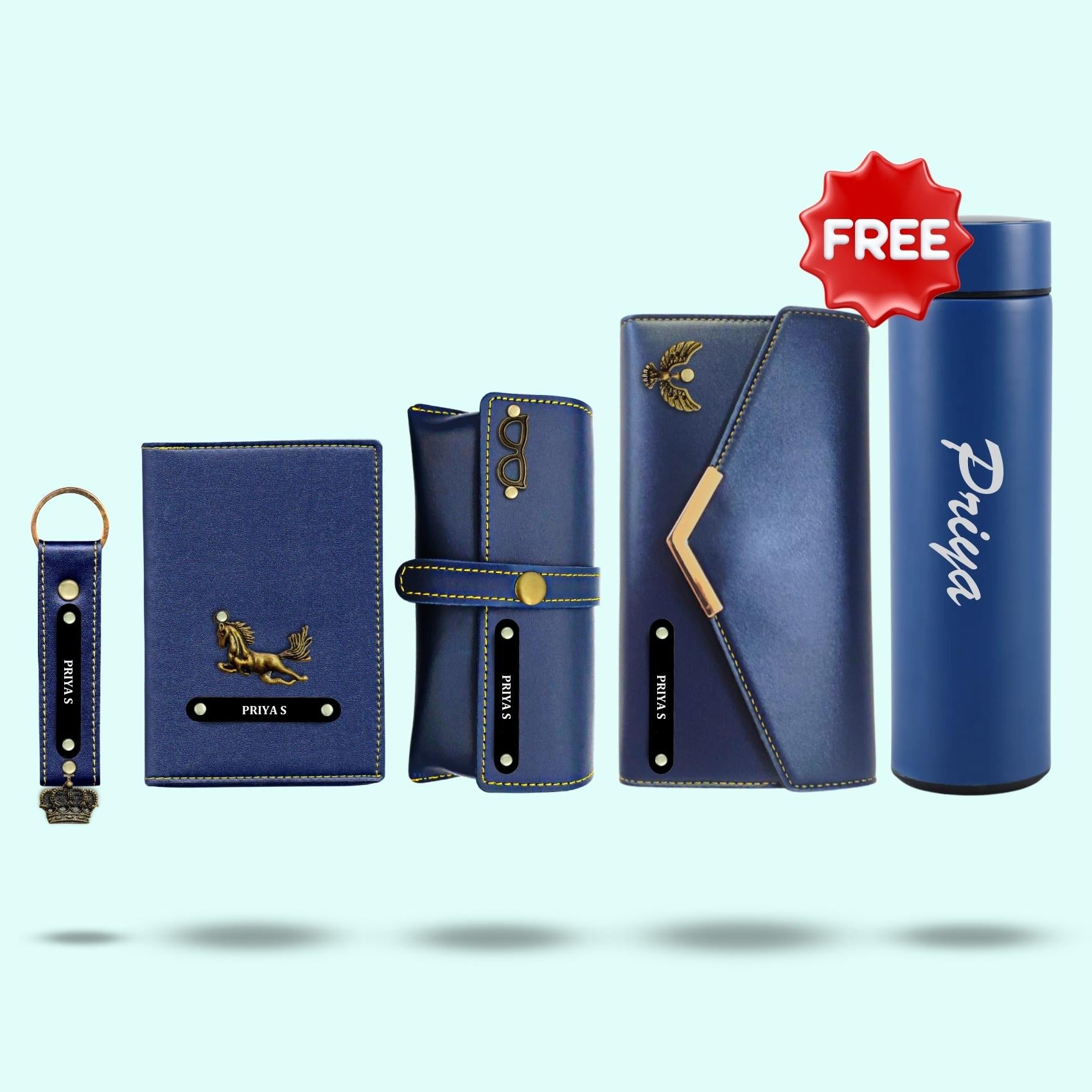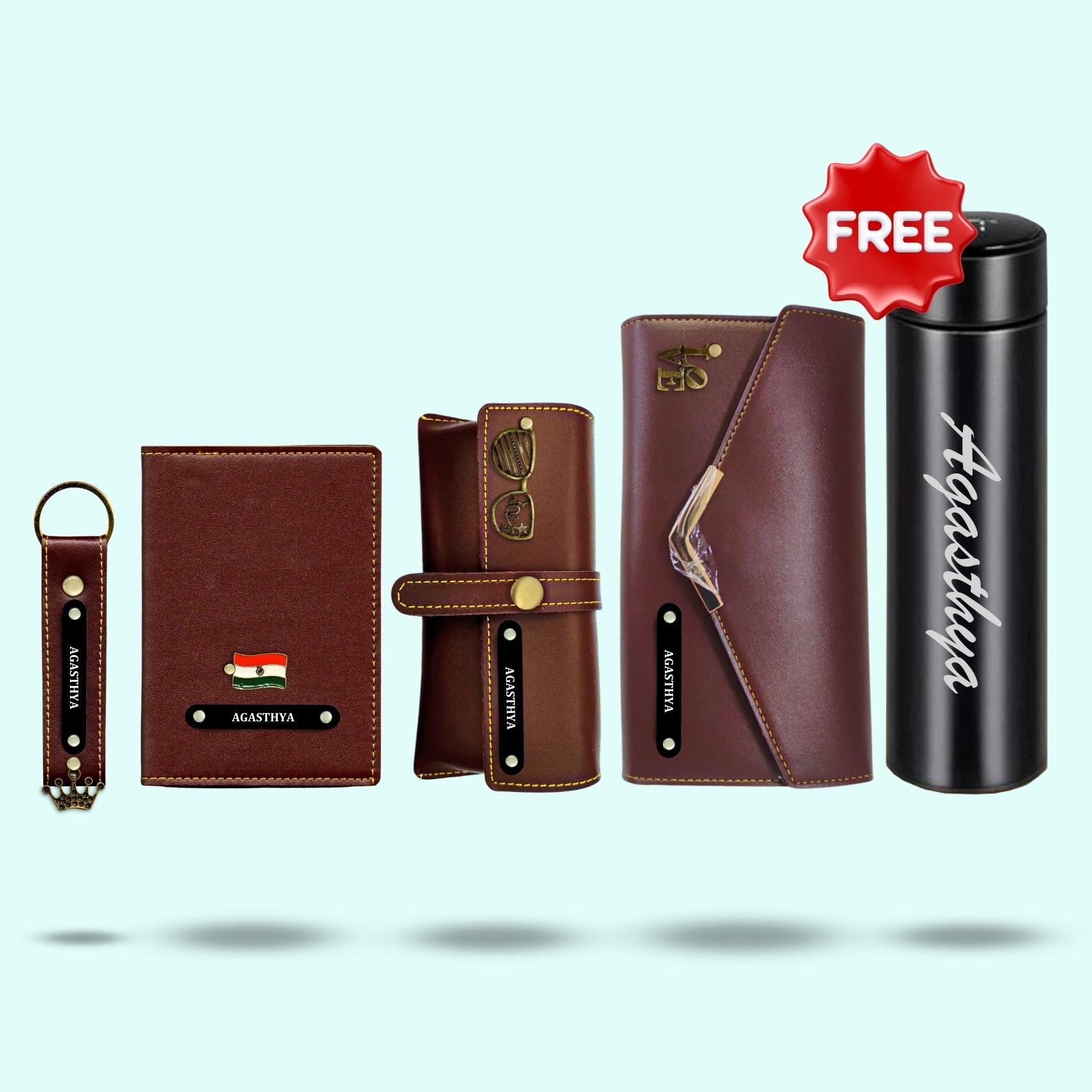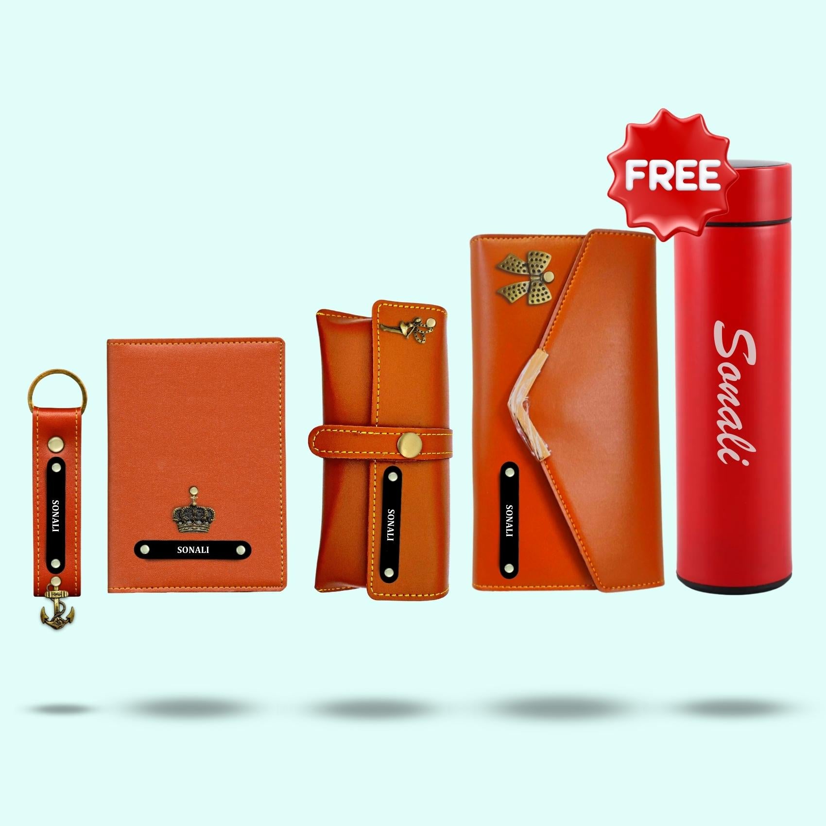This hamper includes the most important things women need on a day-to-day basis. A Wallet for their cards and currency, a passport cover for their passports, a sunglass case for their shades/goggles, a keychain for their keys, & a bottle with LED display for showing the water temperature.
