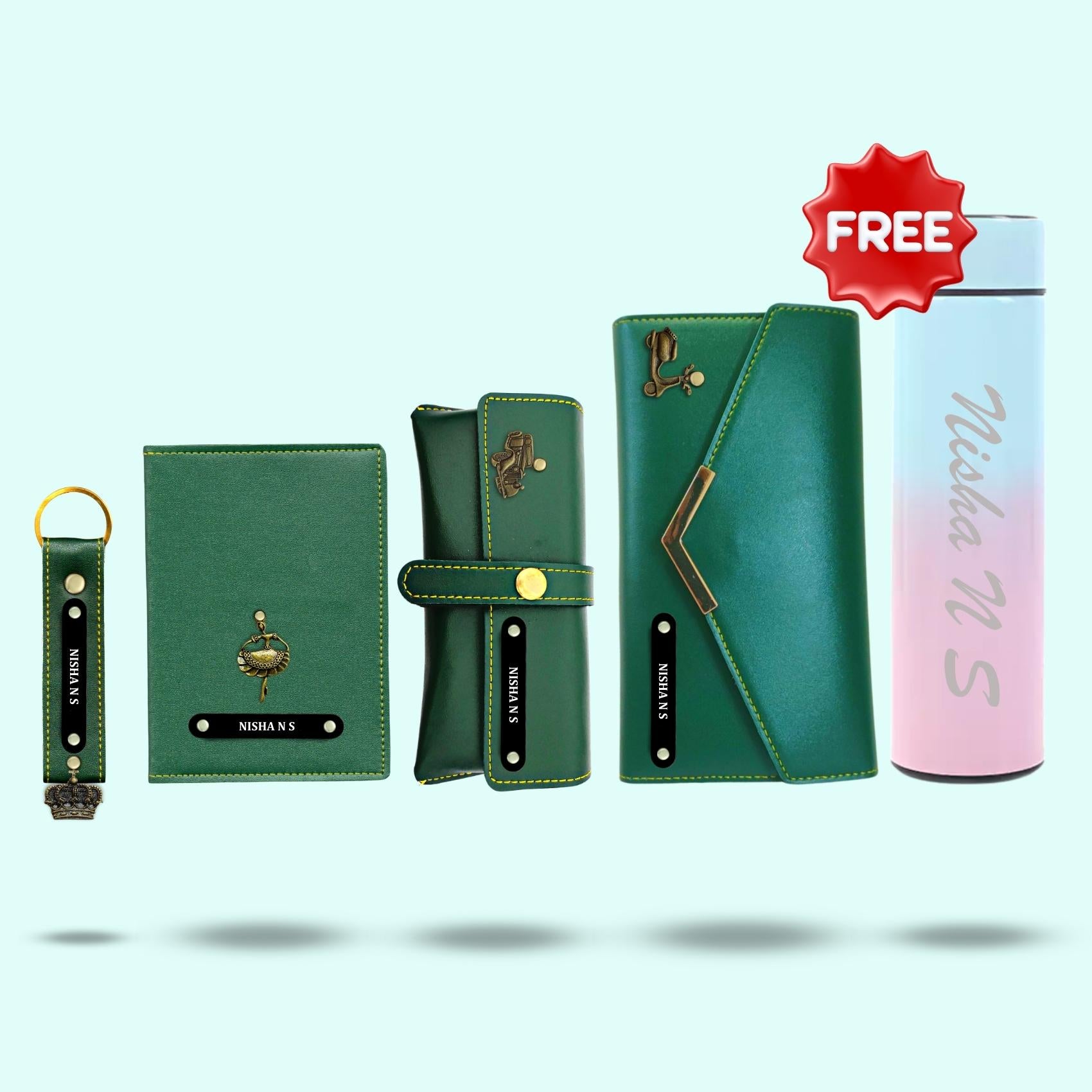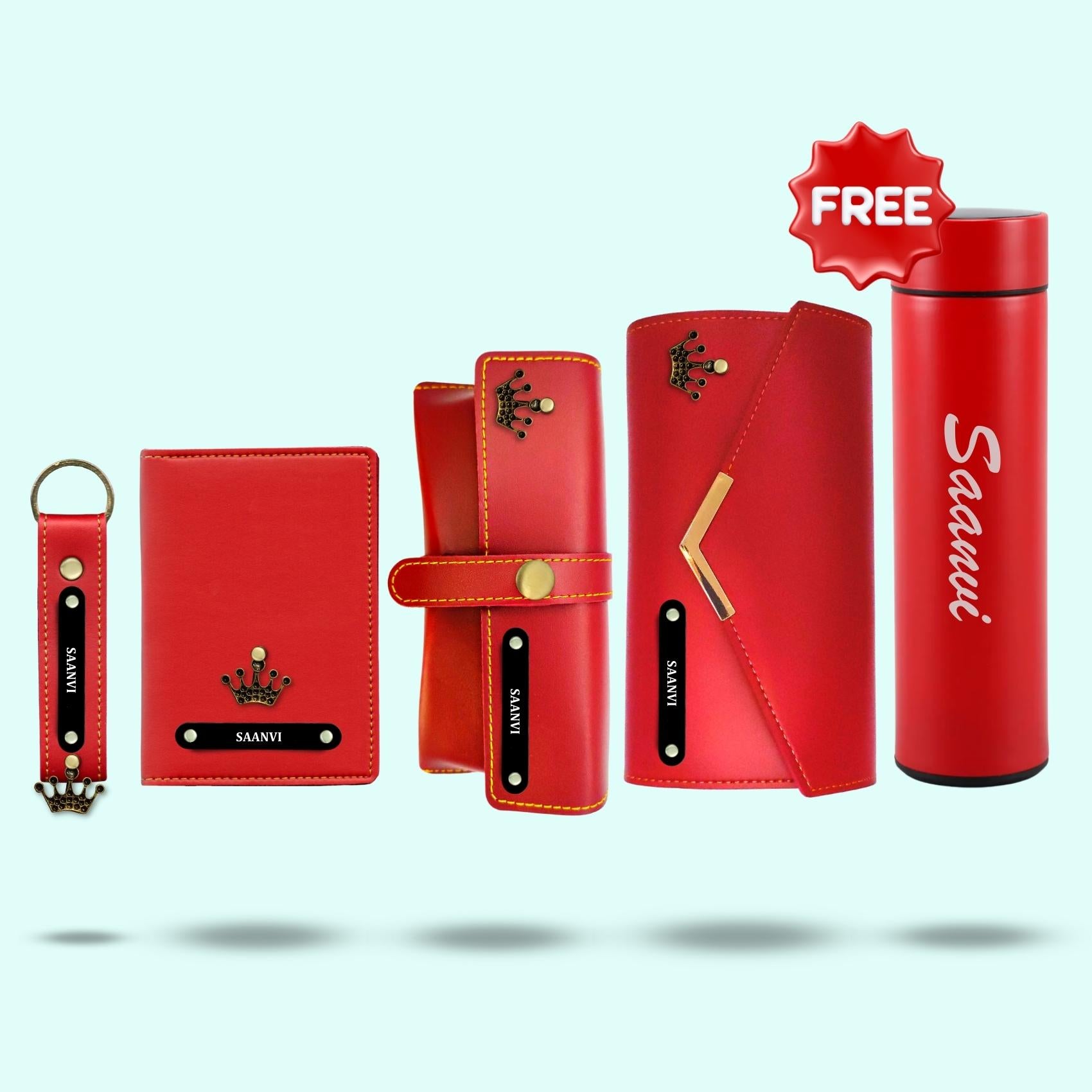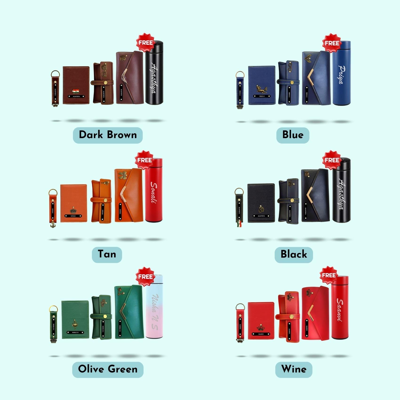 This hamper includes the most important things women need on a day-to-day basis. A Wallet for their cards and currency, a passport cover for their passports, a sunglass case for their shades/goggles, a keychain for their keys, & a bottle with LED display for showing the water temperature.