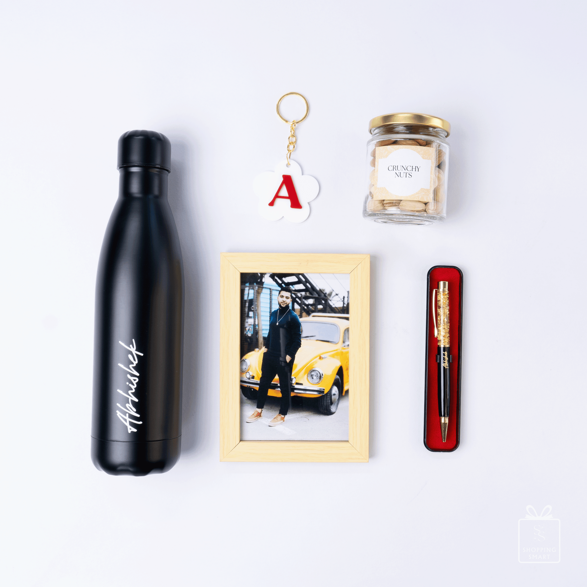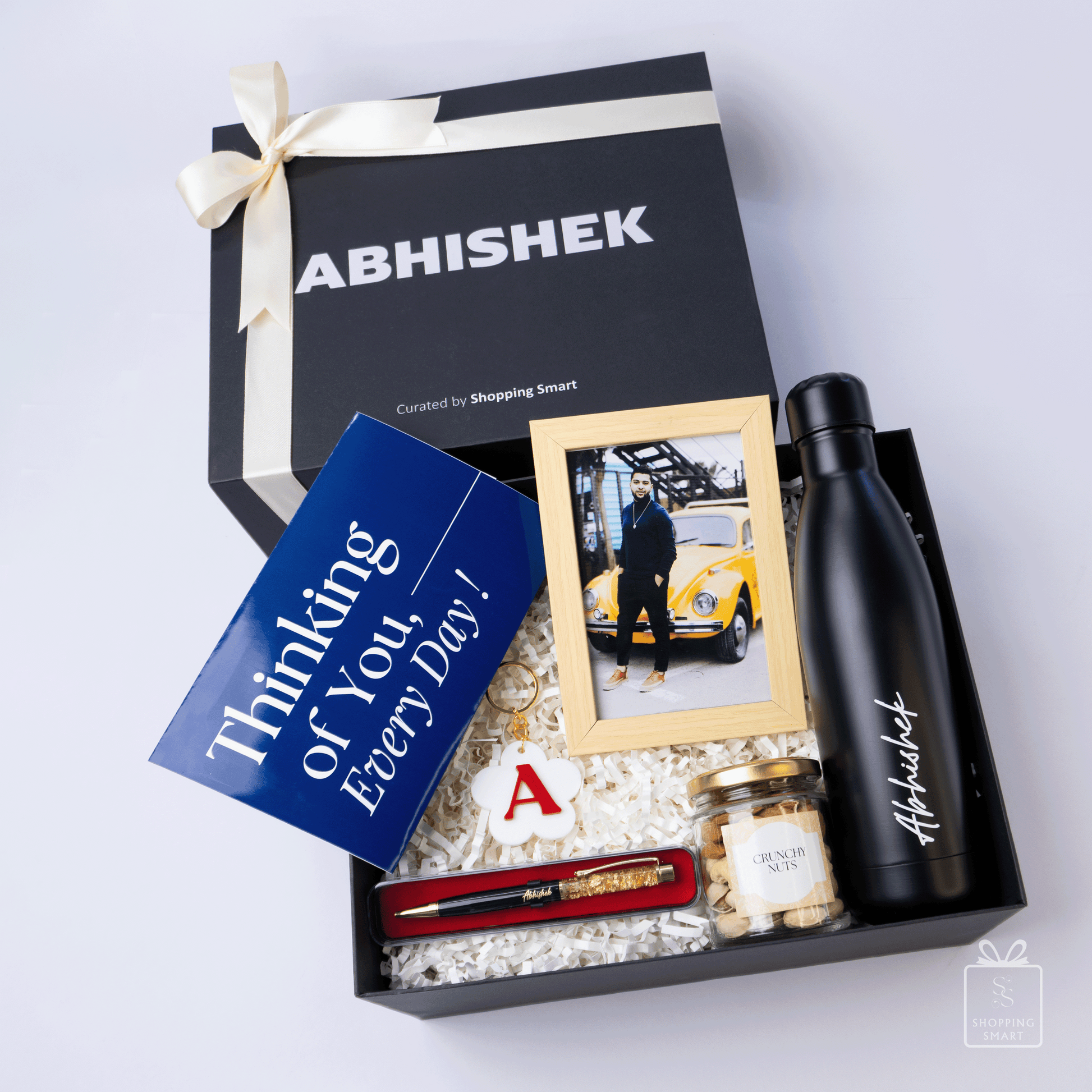 Unwrap elegance with this thoughtfully curated gift set featuring a sleek stealth hydration bottle 750ml, luxury pen, crunchy nuts 100gms, initial keyring, heartfelt message card, and a memory frame 4r. Perfect for birthdays, anniversaries, wedding, milestones, or corporate gifting—this hamper blends style, utility, and personal charm.
